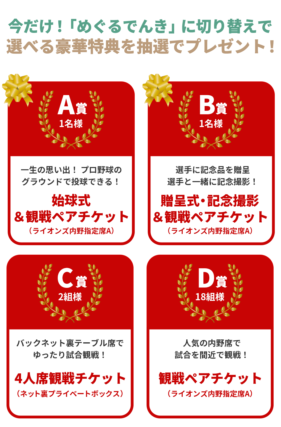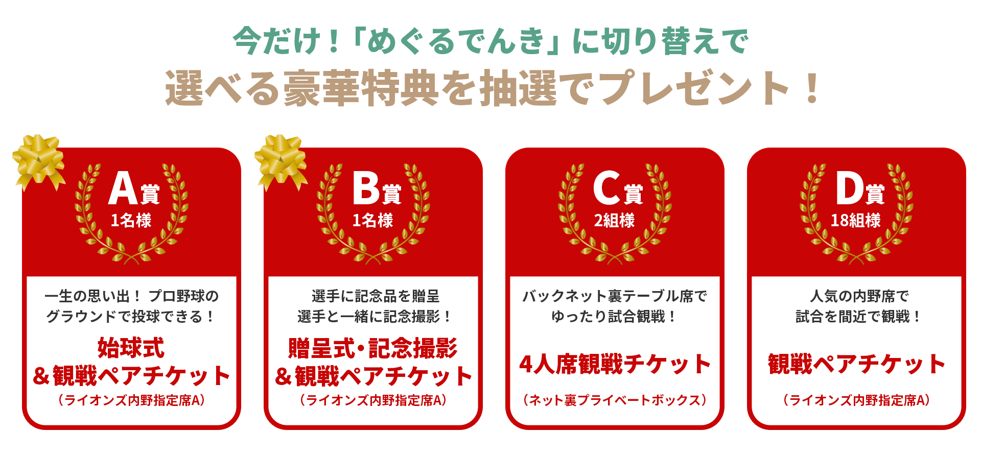 めぐるでんき新規ご契約者様を対象に、2026年6月26日(金)ベルーナドームにて当社がゲームスポンサーとして開催する 「めぐるでんきスーパーナイト|埼玉西武ライオンズ vs 北海道日本ハムファイターズ」に抽選でご招待いたします。